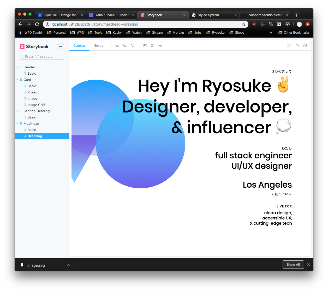 - The portfolio of Kwok Yin Mak was the perfect example I needed for handling vertical or Japanese text. And it exhibitied the same kind of strong typography, extra padded, and 1px borders I was vibing with. I didn't want to go full horizontal scroll, but each site component featuring images was great inspiration for MDX components later for project pages.