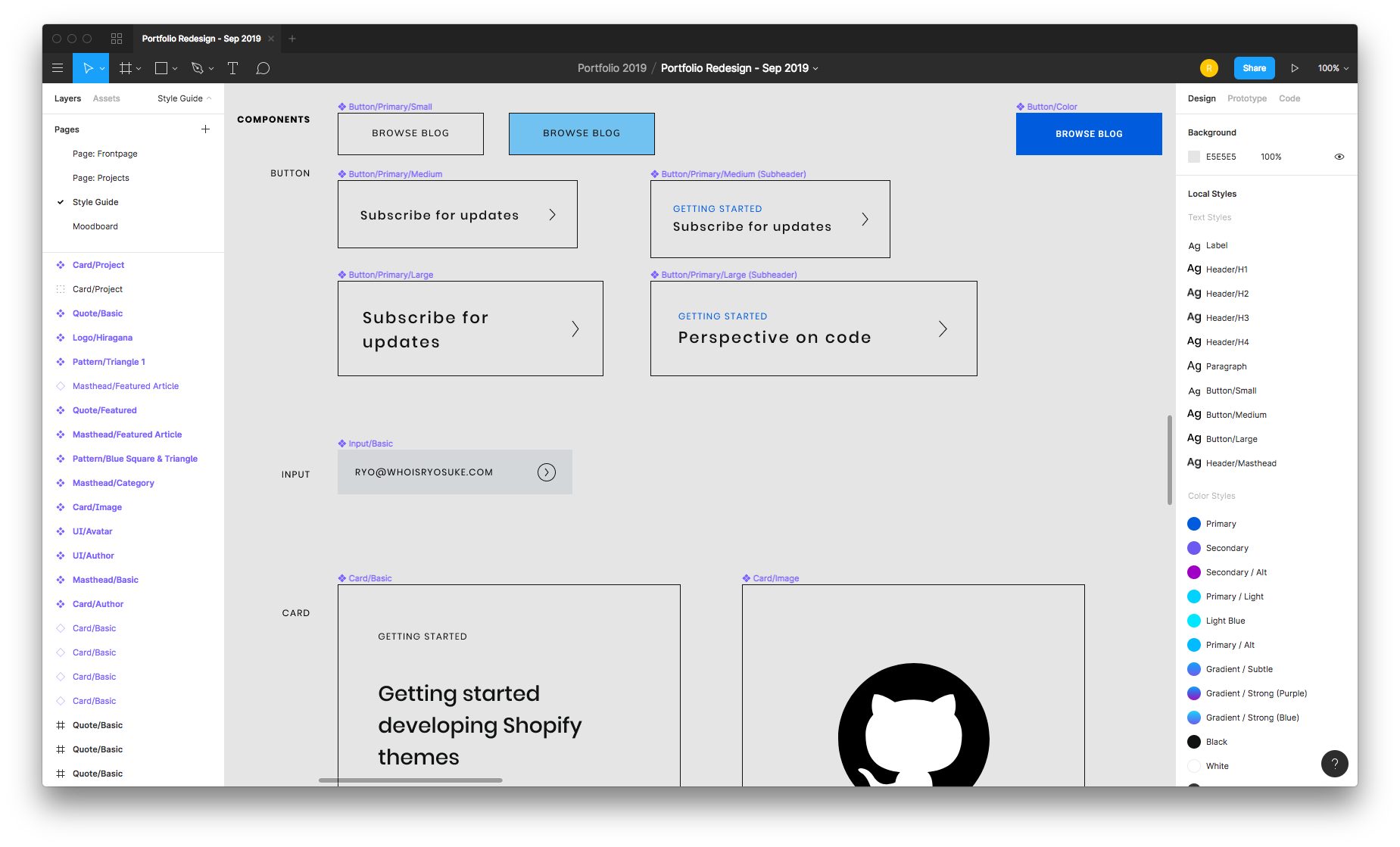 The entire website was developed with a design systems mindset. I started by establishing a more concise style guide using the pre-existing brand assets inside Figma. Figma made it easy to create color and text styles to eventually compose a component library (buttons, cards, just standard things I'd need). These components made it effortless to plug and play them as modules inside page layouts, which served as mockups for pages like the frontpage and blog archive.